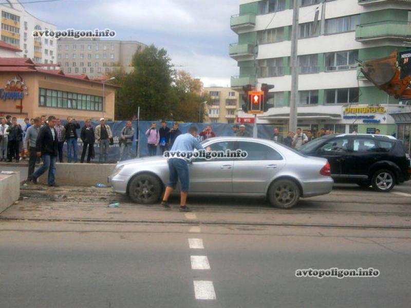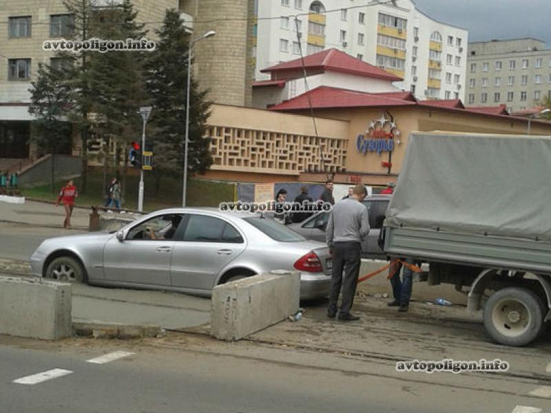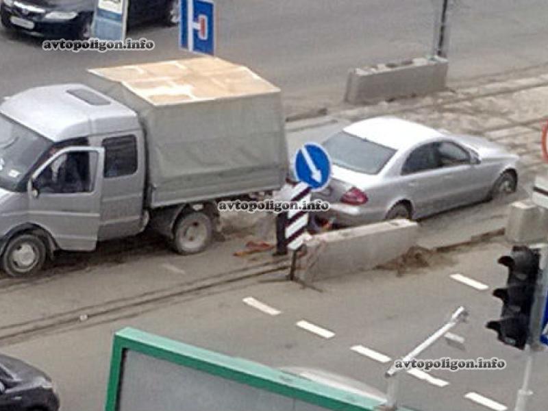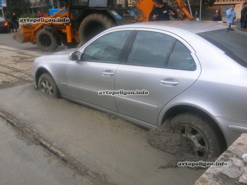 Девушка на Mercedes, объезжая затор, увязла в бетоне (ФОТО)