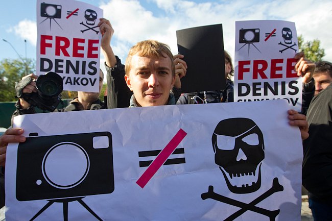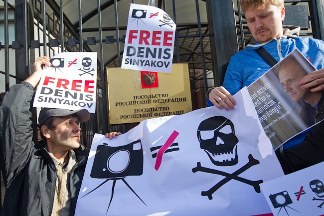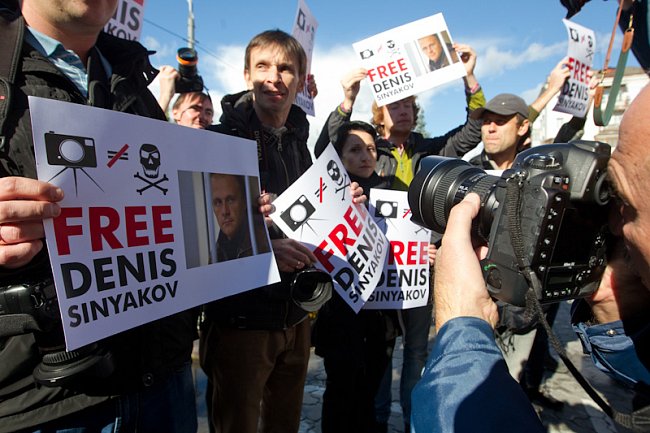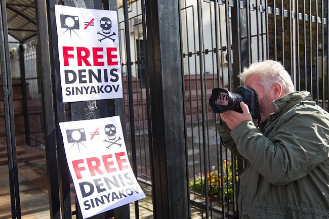 Украинские фотожурналисты провели акцию протеста под посольством Российской Федерации в Украине с требованием освободить из-под стражи российского фотографа Дениса Синякова. В акции приняли участие около сорока фотокоров.