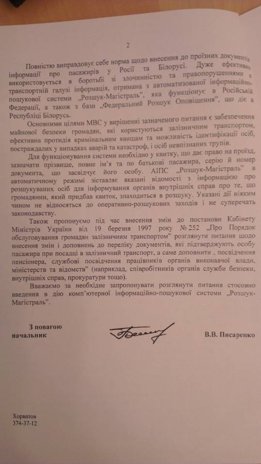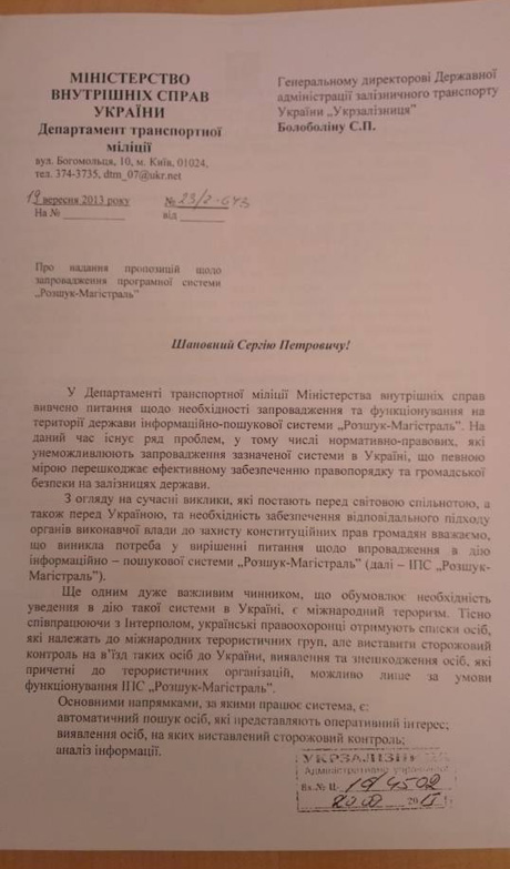 Министерство внутренних дел Украины настойчиво предлагает Укрзализныце вносить билет пассажира кроме ФИО еще паспортные данные. Об этом говорится в письме начальника департамента транспортной милиции, копию которого получил Украинский Хельсинский союз по правам человека.