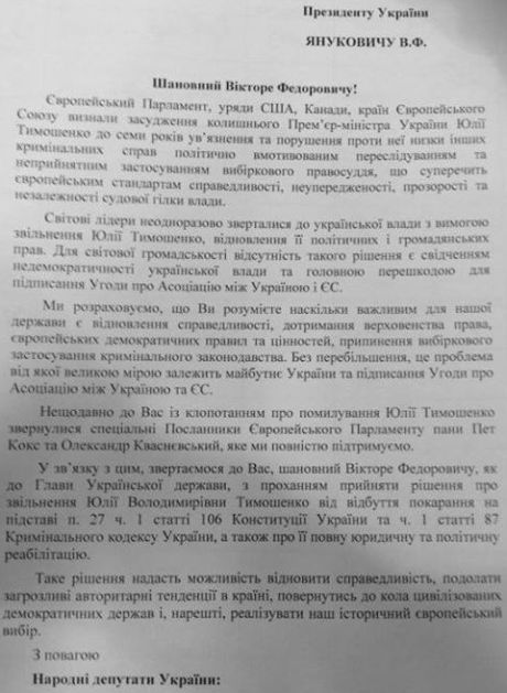 Яценюк напомнил, что наблюдательная миссия Европарламента обратилась к президенту Украины с ходатайством о помиловании Юлии Тимошенко: «В поддержку этого ходатайства мы собрали подписи больше 170 народных депутатов Украины с той целью, чтобы президент Янукович принял решение относительно подписания Соглашения с ЕС и, соответственно, освобождения Юлии Тимошенко и предоставления ей возможности получить медицинскую помощь в Германии – именно то, что было предусмотрено предыдущими договоренностями».
