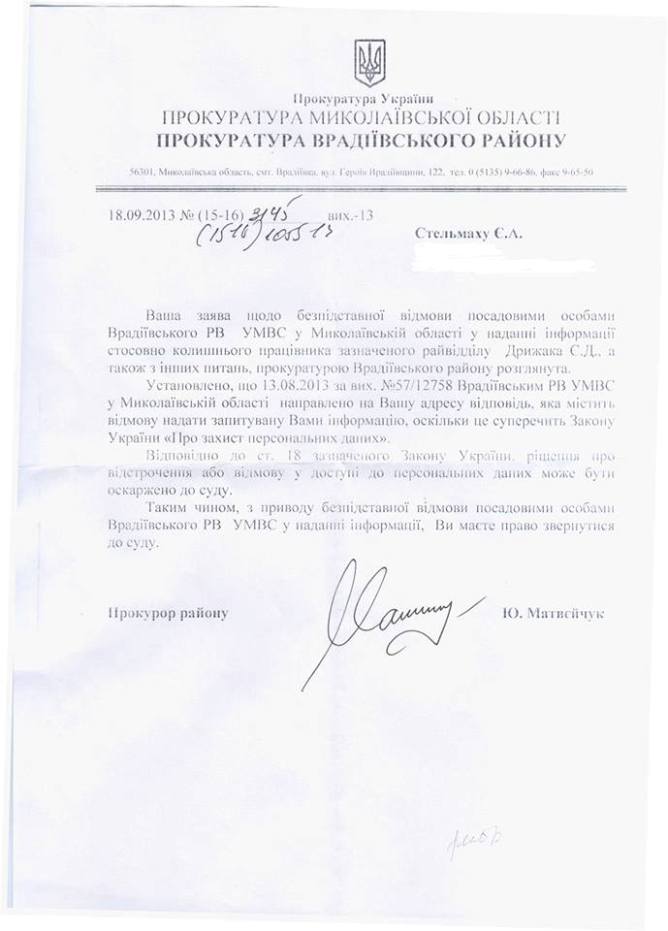 Прокуратура Врадиевского района Николаевской области разъяснила адвокату изнасилованной милиционерами Ирины Крашковой Евгению Стельмаху, почему ему не предоставляют информацию относительно подозреваемого в данном преступлении бывшего работника отмеченного райотдела Евгения Дрыжака. Об этом адвокат сообщил на своей странице в Facebook и разместил ответ прокуратуры.