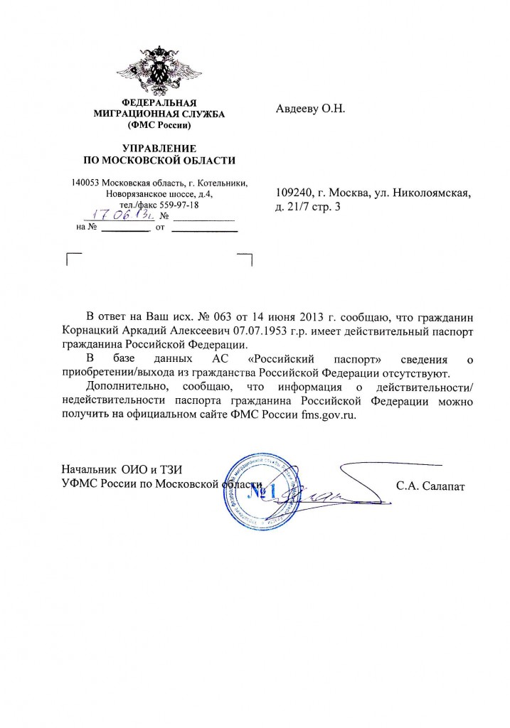 Справка Федеральной Миграционной Службы Российской Федерации от 17.06.2013, где прямо сказано, что у него есть действительный паспорт гражданина РФ