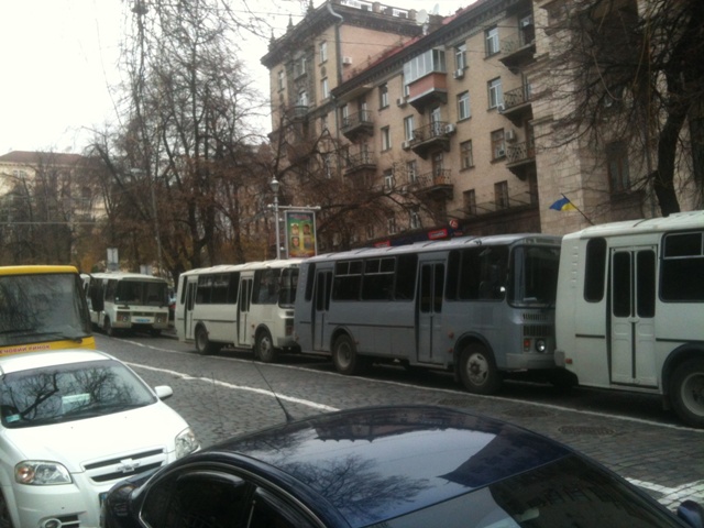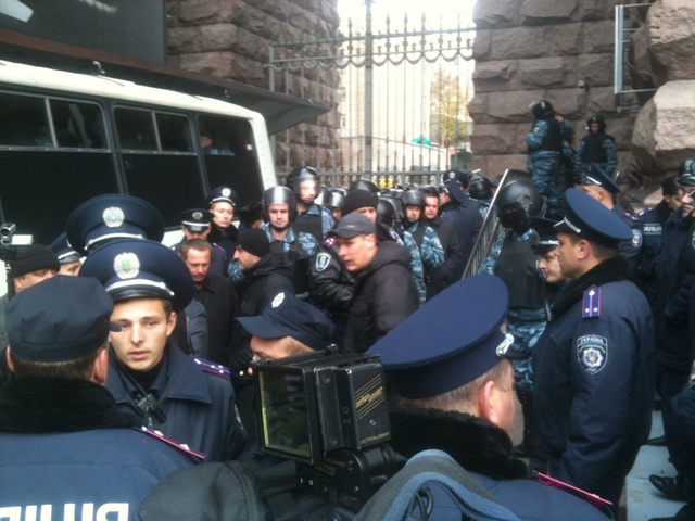 Вход в здание огражден сплошными металлическими щитами, вдоль которых цепочкой выстроились милиционеры. Кроме того, автобусы с милицией стоят вдоль улиц Лютеранской и Прорезной.