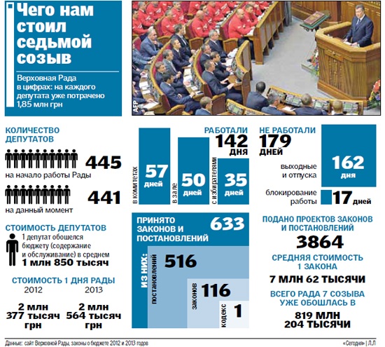 За время работы депутаты приняли 633 закона и постановления. Вместе с тем, избранники зарегистрировали 3864 законопроекта. Таким образом, себестоимость одного закона составила более 7 миллионов гривен.