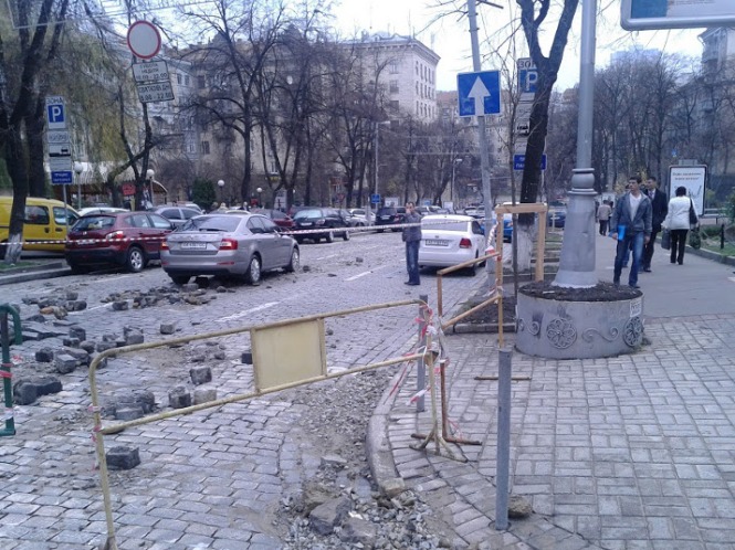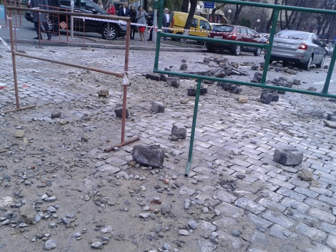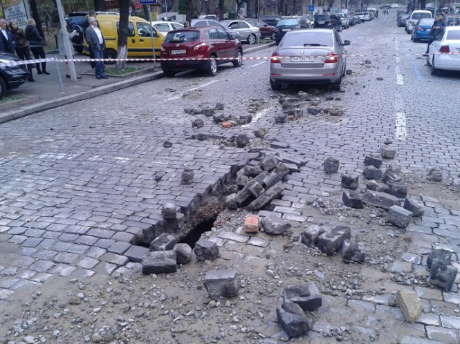 В центре Киева на проезжей части на пересечении улиц Прорезной и Пушкинской появились трещины и вылетела брусчатка.
