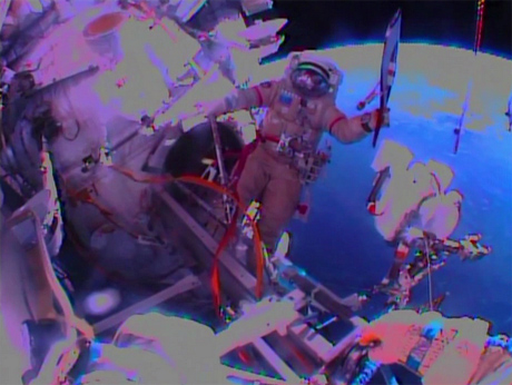 Как и планировалось, космонавты вынесли гермобокс с кронштейном, на котором закреплена видеокамера. Они проводят фото- и видеосъемку друг друга с Олимпийским факелом на фоне выходного люка.