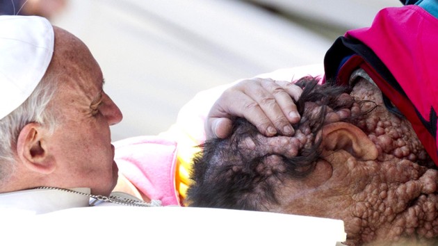 Франциск поцеловал и благословил мужчину, чье лицо изуродовала редкая болезнь – нейрофиброматоз. Папа возложил руки на голову несчастного и прочитал молитву, закрыв глаза.
