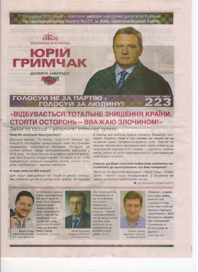 В листовке приводятся отзывы Стеця и Дония о Гримчаке. В частности, Стець отметил: «Я прошел с ним не только парламентские бои, но и уличные акции. Юрий Гримчак – принципиальный и прямолинейный. Я буду поддерживать его, потому что так правильно, потому что он так же поддержал бы меня, потому что дружба существует и среди политиков».