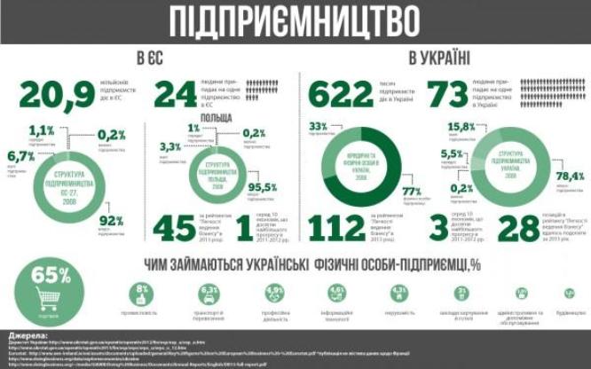 В ЕС на одно предприятие приходится 24 человека, в Украине 73. В Польше частица микропредприятий (до 10 работников) составляет 95,5%, что является наивысшим показателем среди стран Европы и обеспечивает экономический рост несмотря на кризис. В Украине их лишь 78%. Три четверти украинских предприятий – физические лица, но большая часть из них не производят собственные продукты, не предоставляют услуги и собственно даже не занимаются бизнесом, просто работают продавцами, как правило на базарах.