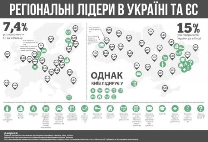Как и в структуре видов деятельности, так и в географической плоскости, у украинского бизнеса есть значительные проблемы с равномерным распределением: 15% всех предприятий действует в Киеве, восточные регионы лидируют по количеству не только промышленных предприятий, но и тех, которые специализируются на финансах, операциях с недвижимостью, строительстве, образовании, медицине и т.п. Между тем в ЕС наибольшее количество предприятий зарегистрировано в наибольших странах, однако большинство отраслевых лидеров - это страны, чья площадь и/или население не превышают соответствующие показатели Киевской области.
