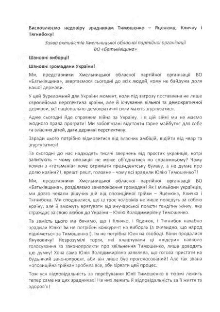 «Мы, представители Хмельницкой областной партийной организации ВО «Батькивщина», разделяем обеспокоенность граждан! Как и миллионы украинцев, мы долго ждали решительных действий от оппозиционной троицы - Яценюка, Кличко и Тягнибока. Мы надеялись, что эти трое мужчин не только поведут за собой страну, но и смогут спасти от янучарской мести хрупкую женщину, которая страдает за свою любовь к стране - Юлию Владимировну Тимошенко», - пишут они.