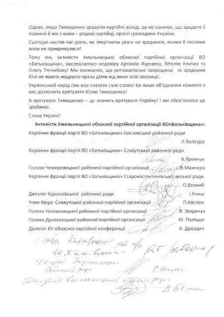 Под заявлением подписали руководители фракции партии ВО «Батькивщина» Изяславского и Славутского районных советов, глава Чемеровецкой районной партийной организации, руководитель фракции партии ВО «Батькивщина» Староконстантиновского городского совета, депутат Красиловского райсовета, член бюро Славутской районной парторганизации, глава Новоушицкой районной парторганизации, глава Дунаевецкой районной парторганизации, делегат XV областной партийной конференции.