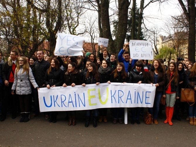 Протестующие держат транспаранты «Наш выбор – ЕС», «Студенты за будущее в Европе», «Приобщи ЕС к друзьям».