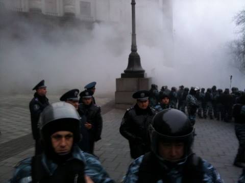 Сейчас над улицей Грушевского поднимается дым. Судя по всему, из толпы в сторону Кабмина полетело несколько дымовых шашек.