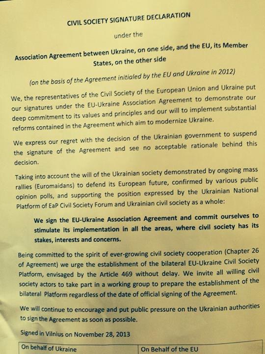 «Под аплодисменты зала началась процедура символического подписания Соглашения об Ассоциации представителями гражданского общества из Украины и ЕС. Все активно подписывают. Если не может власть, сделаем мы!!!», - написал он.