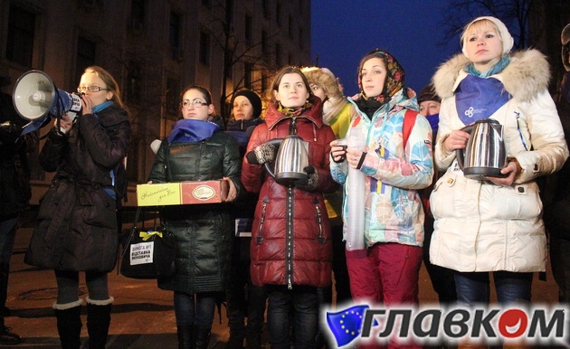 Участники акции протеста, которые взяли в осаду здание Администрации Президента Украины, угощают сотрудников спецподразделения «Беркут» горячим кофе и пирожками. Об этом сообщает корреспондент «Главкома».