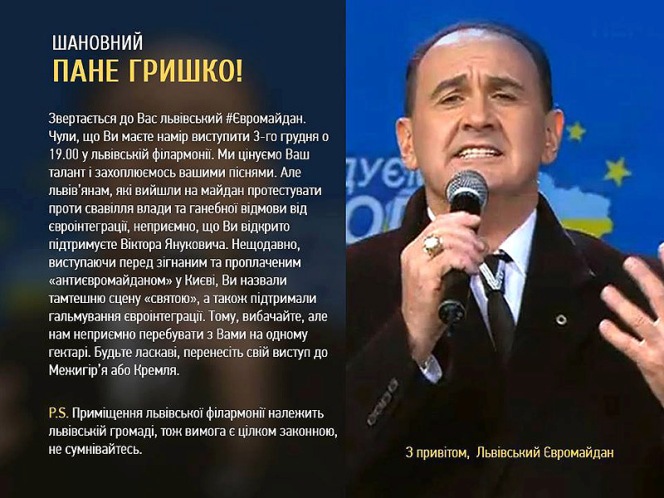 Во Львове не забыли, как 29 ноября Гришко пел в Киеве перед собранным регионалами митингом в поддержку приостановки Януковичем евроинтеграции. В частности, то, что певец назвал сцену митинга Партии регионов «святой» и заявил, что «очень рад быть сейчас на площади и исполнять свои произведения для настоящих украинцев».