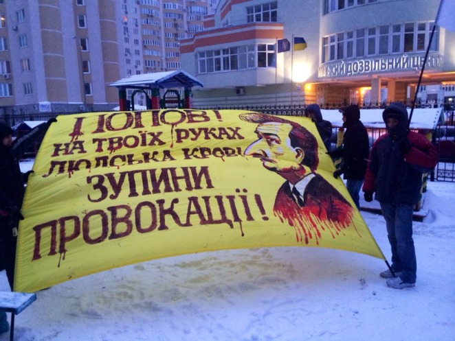 Митингующие обвиняют Попова в создании предпосылок для силового нападения на мирных протестующих Евромайдана из-за его обращения в органы МВД относительно установления елки и ледового поля, заявлений в суд относительно запрета использования помещений Киевсовета и проведения массовых собраний в Киеве.