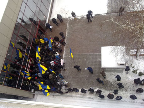 Представительство Евросоюза в Украине заблокировали молодые люди спортивной внешности, которых называют «титушками».