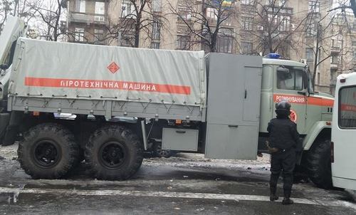 Правительственный квартал практически пуст. На улице Грушевского за кордонами милиции стоят еще три автобуса с бойцами, щиты стоят на улице рядом. Прямо возле Кабинета министров половину ул. Грушевского перекрывают три грузовика. Кроме того, сегодня со стороны улицы Садовой была замечена машина с надписью «Розмінування».