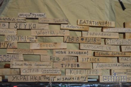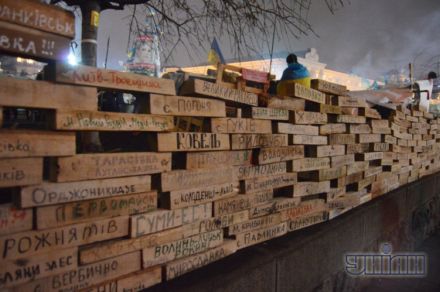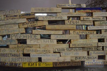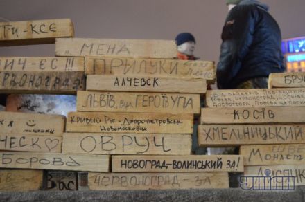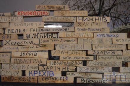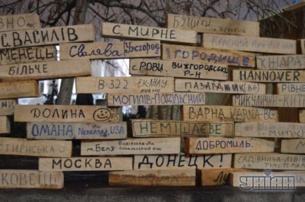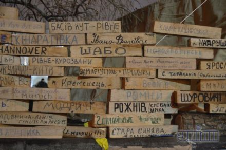 Это стена из деревянных брусков, на каждом из которых написано название города Украины, из которого прибыли протестующие, сообщает УНИАН.