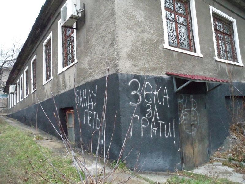 В Торезе мужчину, расписавшего центр города лозунгами против Януковича и Партии регионов, избил нагайкой депутат городского совета Василий Бондаренко.
