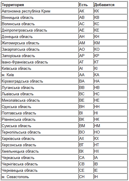 В большинстве случаев буквосочетания для новых номерных знаков строятся по правилу замену первой буквы. Там, где вначале стояла буква А появилась буква К, буквосочетания с первой буквой В заменили на соответствующие слова с буквой Н, а С — стала украинской буквой I, сообщает УНИАН, ссылаясь на autoua.net.