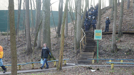 «В лесной заповедник, вопреки законам и Конституции Украины, паломников не пустили неизвестные в форме сотрудников МВД. Возможно, это вызвано тем, что с возвышения в лесу просматривается часть резиденции», - отмечают активисты.