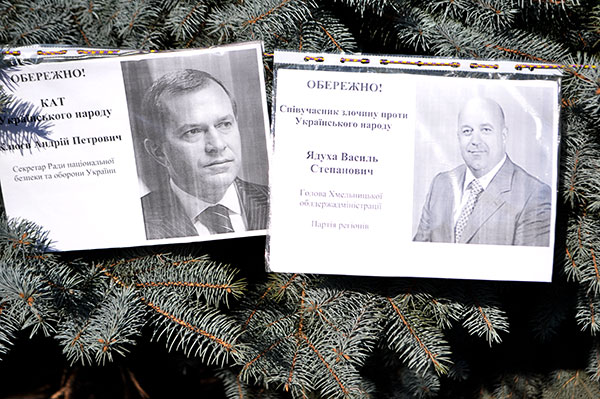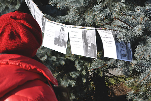 12 портретов украинских политиков, начиная от президента Виктора Януковича и заканчивая депутатами областного совета, которые не поддержали отставку правительства Николая Азарова, вывешены на зеленую красавицу с надписями: «Осторожно! Палач украинского народа» и «Осторожно! Соучастник преступления против украинского народа».
