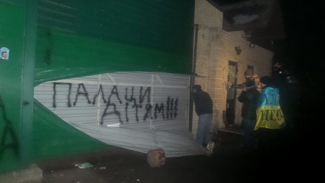 Сейчас митингующие пишут краской на воротах и заборе лозунги. В частности, они написали: «Палаци дітям!».