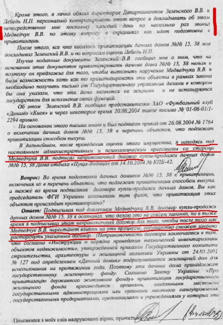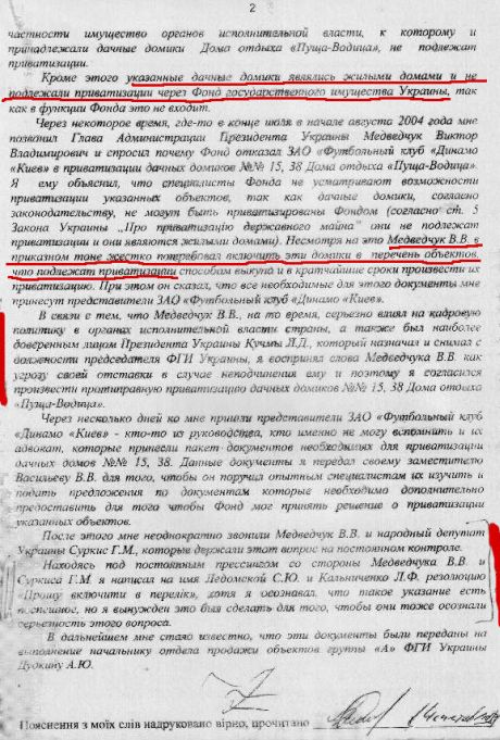 В протоколе явки с повинной за 25 августа 2005 года и объяснении к нему тогдашний глава Фонда госимущества Чечетов сообщил, что под давлением тогдашнего главы Администрации президента Медведчука разрешил незаконную приватизацию домиков в Пуще-Водицы в пользу ЗАО «Футбольный клуб Динамо-Киев», пишет Українська правда.