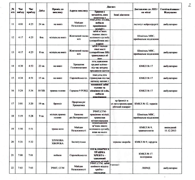 Количество потерпевших граждан, доставленных в медицинские заведения Киева в результате столкновений с правоохранительными органами на протестных акциях 1 и 11 декабря прошлого года, составляет, соответственно, 165 и 49 человек. Об этом говорится в официальном ответе департамента здравоохранения КГГА, предоставленном на депутатское обращение Геннадия Москаля.