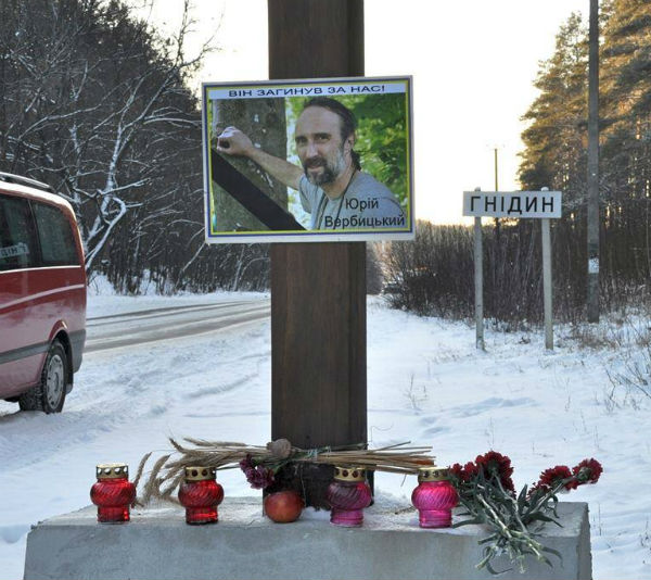 Жители села Гнидын Бориспольского района Киевской области установили памятник на месте, где было найдено тело убитого активиста Евромайдана Юрия Вербицкого.