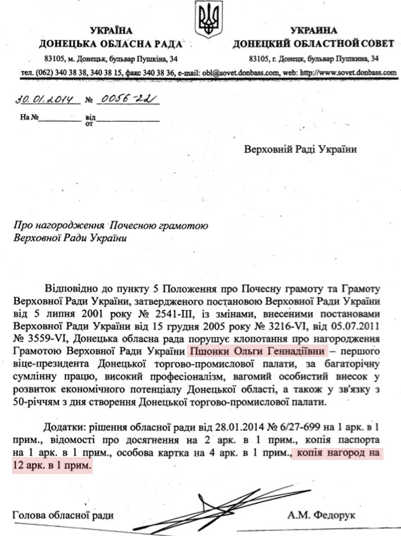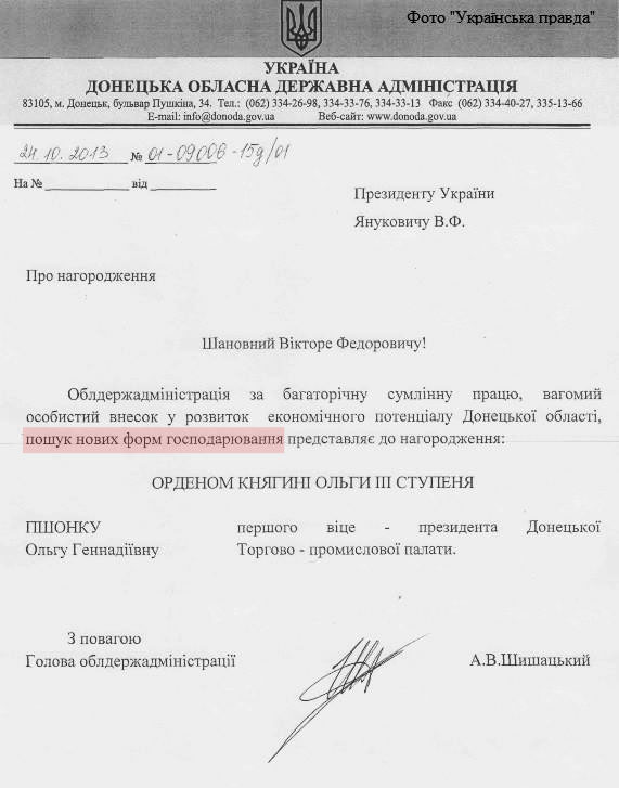 «В представлении Донецкого областного совета ничего не сказано о «поиске новых форм хозяйствования» Ольгой Пшонкой... В документе донецкие депутаты просят старших коллег из парламента дать Пшонке грамоту просто «за многолетний добросовестный труд, высокий профессионализм, весомый личный вклад в развитие экономического потенциала Донецкой области», - отмечает Лещенко.