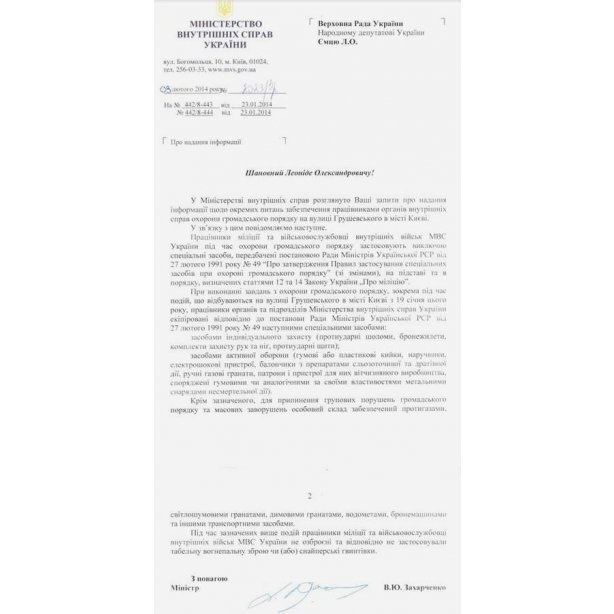 Министерство внутренних дел предоставило официальный перечень спецсредств, которые использовали правоохранители на ул. Грушевского в Киеве. Как сообщил депутат от «Батькивщины» Леонид Емец, об этом говорится в ответе на его запрос.