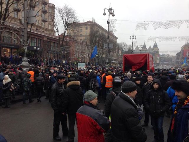 Тем временем на Майдане Незалежности отряды самообороны объявили мобилизацию, люди стягиваются в баррикаде на пересечении Крещатика и Богдана Хмельницкого. С наружной стороны укрепления выстроились несколько сотен участников самообороны. Они скандируют «Слава Украине! Героям слава!», а в сторону противников выкрикивают «Позор!».