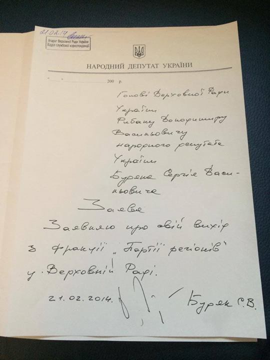 Народный депутат Сергей Буряк написал заявление о выходе из фракции Партии регионов.