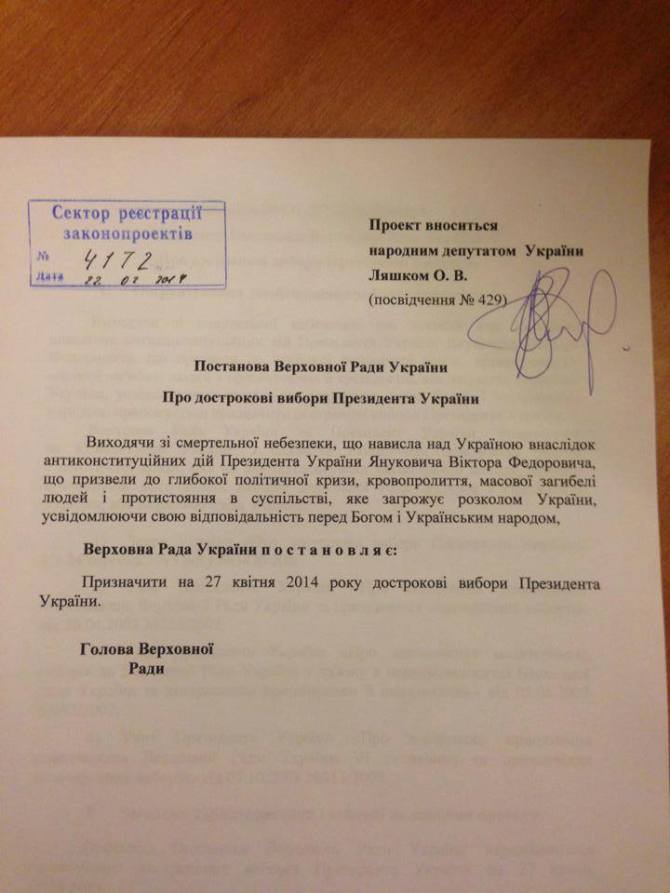 В Верховной Раде зарегистрирован проект постановления о проведении досрочных выборов президента Украины 27 апреля 2014 года.Автор проекта – внефракционный народный депутат Олег Ляшко.