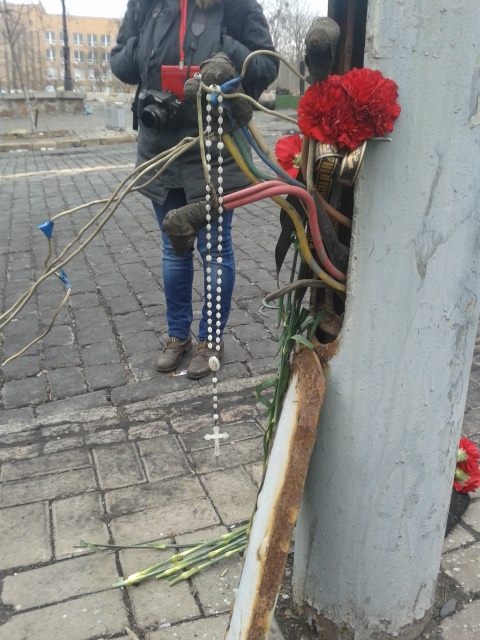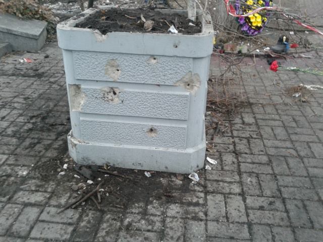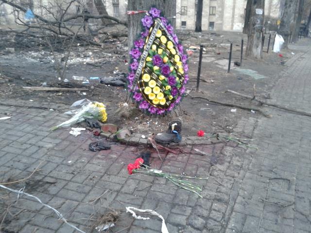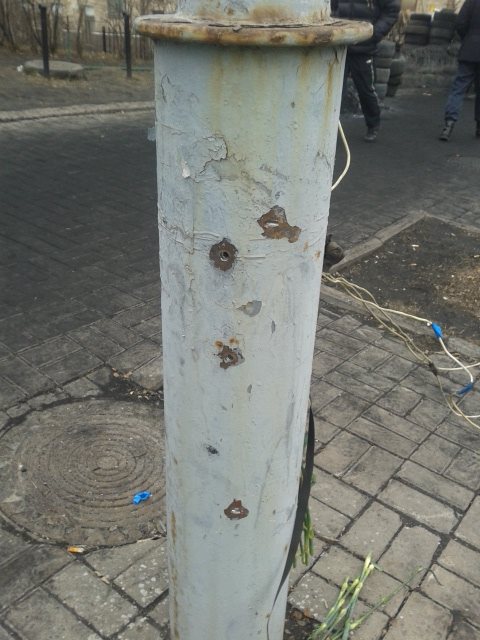 Цветы лежат также практически у каждого дерева. Бойцы самообороны Майдана демонстрируют людям столбы со следами от пуль. На многих столбах сквозные дыры от пуль.