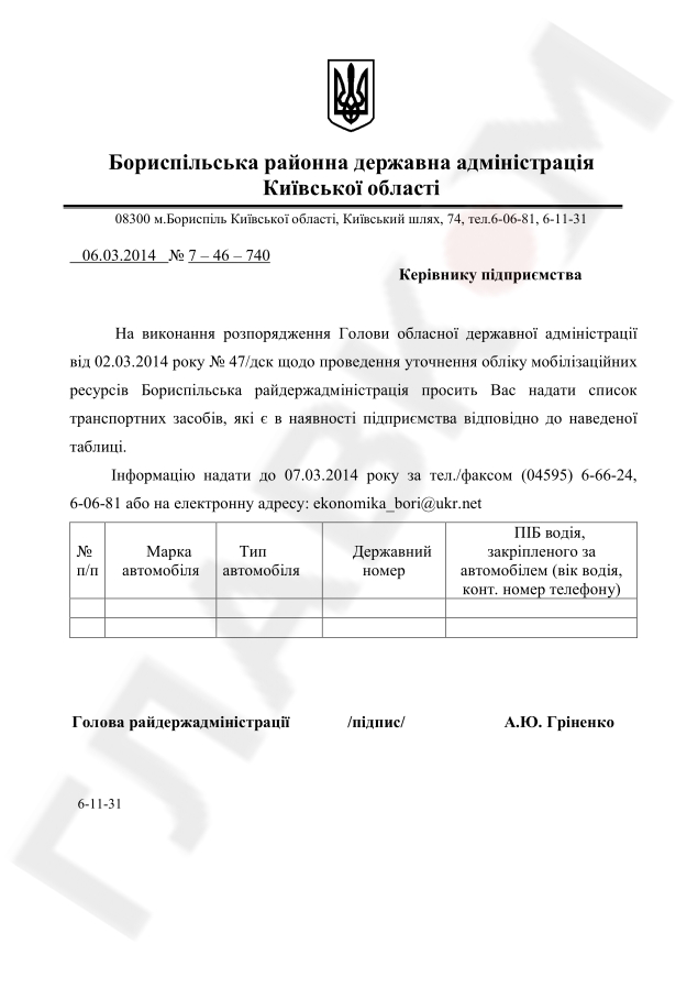 «Во исполнение распоряжения Председателя областной государственной администрации от 02.03.2014 года о проведении уточнения учета мобилизационных ресурсов Бориспольская райгосадминистрация просит Вас предоставить список транспортных средств, которые есть в наличии предприятия в соответствии с приведенной таблицей», - говорится в тексте документа.