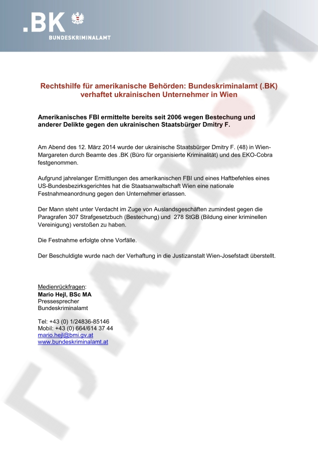 Вместе с тем, в сообщении, которое распространило, австрийская криминальная полиция, отмечается, что мужчина был задержан по подозрению в причастности к созданию организованной преступной группы и подкупе. Задержание прошло без инцидентов. После ареста подозреваемый был направлен в тюрьму Вены.