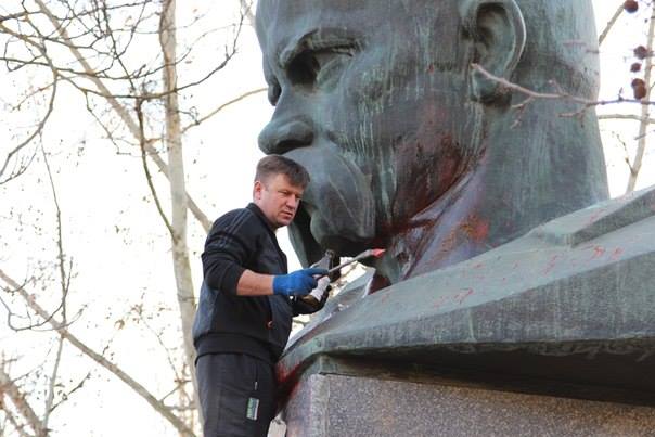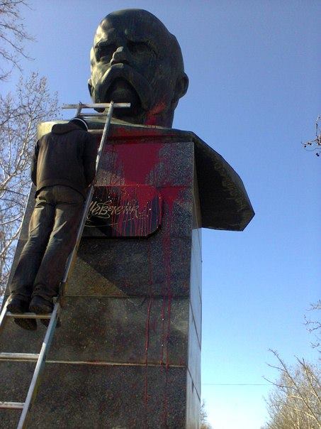 18 марта в Херсоне неизвестные облили красной краской памятник Тарасу Шевченко и нарисовали свастику.