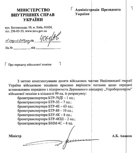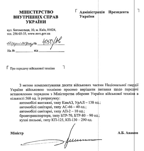 Министерство внутренних дел Украины обратилось в Администрацию президента с просьбой обеспечить Национальную гвардию Украины военной, авиационной и автомобильной техникой.