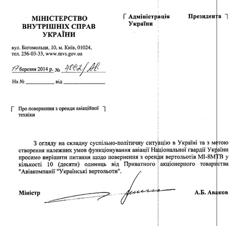 Также министр просит передать Нацгвардии 4 самолета Ан-32 «Б» госпредприятия «Антонов». Кроме этого, Аваков предлагает вернуть из аренды 10 вертолетов МИ-8МТВ, которые сейчас находятся в пользовании ОАО «Авиакомпании» Украинские вертолеты». У Государственной пограничной службы предлагается взять 1 самолет АН-72.