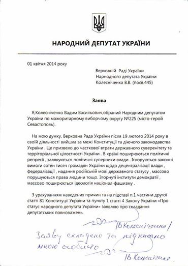 «Друзья, остаюсь верен Вам и своей политической позиции. Подал официальное заявление о сложении депутатского мандата прекратившего свое реальное существование украинского парламента. Считаю, что в это рубежное время каждый должен выбрать на какой он стороне: веры, правды и совести или должностей и денег. Уверен, что Победа будет за нами! За нами правда и великая история, честь и вера», - написал Колесниченко (орфография и пунктуация сохранены).