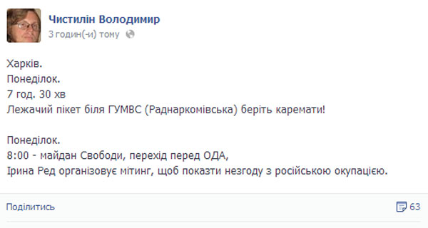 7 апреля харьковчане запланировали две акции – "лежачий пикет" возле здания областного управления милиции в 8.00 и митинг против российской оккупации перед областной администрацией в 8.00.
