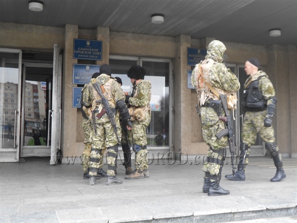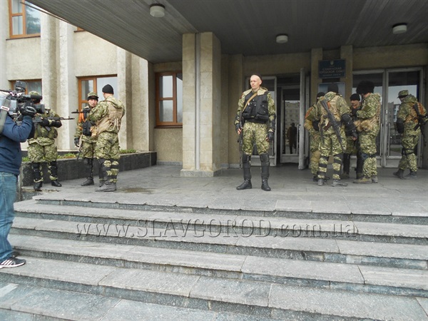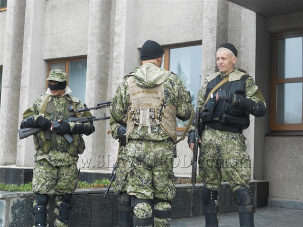 Сегодня утром в Славянске возле здания исполкома появились люди в камуфляжах. Боевики разрешили не только фотографировать себя, но и прокомментировали кто они такие и какая их миссия в городе.