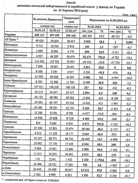 Общая задолженность по заработной плате в Украине на 31 марта 2014 года составила 909,46 миллиона гривен.