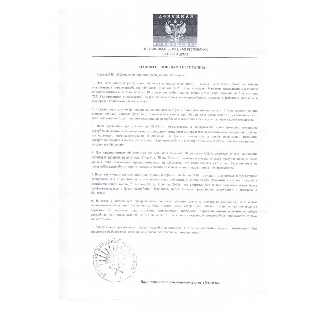 В этих бумагах сепаратисты требуют от бизнесменов платить им единый налог в 70 долл. США ежемесячно «для пополнения золотовалютных резервов республики». Кроме того, украинские акцизные марки на алкоголь объявлены недействительными, а новые «республиканские» сепаратисты готовы продавать по 2 долл. США. С 6 мая представители «Донецкой Республики» обещают конфисковать все спиртные напитки без их акцизов.