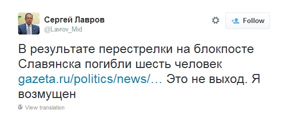 Глава МИД РФ Сергей Лавров заявил, что "возмущен" в связи с событиями в Славянске и приглашает власть Украины за стол переговоров.